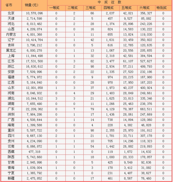 当期的红球奖号分布几乎重复了上期的分布格局,10以下小号只出了一个04,其他五个奖号除17外均大于23,蓝球则开出了小号码03,总共有9注头奖和42注二等奖中出,湖北的3注头奖为一人所中,售出中奖彩票的是当阳市林业局旁的42170085号投注站,系一张单式3倍投注的彩票,共揽1883万。四川的两注头奖也出自一人之手,出售于成都双星南路3号附208号彩票投注点。该中奖彩票总共投注了5组号码,每个号码投注了两倍,花20元独揽1255万。42注高达41万的二等奖分布于全国22个联销省市自治区,除广东7注、河南4注、山东和江苏各3注外,其他18地均只中了1注和2注。