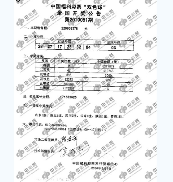 北京时间2010年05月06日晚,中国福利彩票双色球第2010051期开奖,当期开出的奖号为:红球04 17 23 27 28 32;蓝球03。当晚头奖爆出9注627万,花落湖北(3注)、四川(2注)、山东、云南、陕西和青海等6省,其中湖北的3注和四川的2注均为彩民倍投所中,分别中得1883万和1255万;二等奖开出42注41万。当期销量2.29亿,计奖后奖池1.71亿滚入下期头奖。祝贺湖北一彩民获1883万大奖>>>