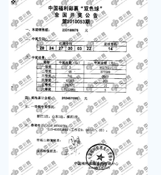 北京时间2010年05月11日晚,中国福利彩票双色球第2010053期开奖,当期开出的奖号为:红球03 22 24 27 28 30;蓝球14。头奖开出3注902万,被浙江、山东和深圳3省市彩民中得,二等奖仅出48注37.7万。当期销量达2.33亿,奖池2.02亿滚入下期头奖奖池。祝贺3位彩民中得902万大奖>>>