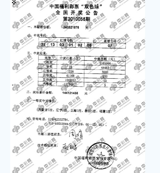 北京时间2010年05月18日晚,中国福利彩票双色球第2010056期开奖,当期开出的奖号为:红球01 02 03 08 13 32;蓝球07,开奖号码相对比较怪异。当晚头奖开出5注516万,被辽宁、内蒙古、浙江、上海和福建等5地彩民中得;二等奖开出28注,单注仅4.4万。由于最大遗漏蓝07开出,当期固定奖出现井喷,六等奖共爆出1775万余注。当期销量2.43亿,计奖后奖池1.44亿滚入下期头奖。[祝贺5省市彩民中得516万头奖!]
