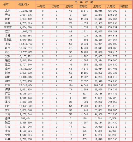 当期的红球奖号集体偏大,头码开出08,外加两组连号,有一定难度,蓝球开出遗漏13期的奇数号11。8注头奖分别由河北、辽宁、黑龙江、江苏、广东、四川和深圳(2注)等7地彩民分享;73注二等奖分布于全国24个联销省市自治区,其中浙江中9注、江苏和新疆中6注、云南和山东中5注较为突出。