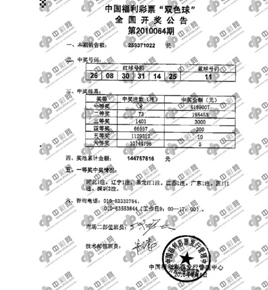 北京时间2010年06月06日晚,中国福彩双色球第2010064期开奖,当期开出的奖号为:红球08 14 25 26 30 31;蓝球11。当晚头奖开出8注618万,被七地彩民摘得,深圳独揽2注,二等奖开出73注19.5万。当期销量2.59亿,计奖结束后奖池余额1.44亿滚存下期头奖。祝贺7省市彩民收获618万大奖!