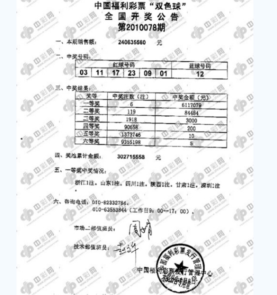 北京时间2010年07月08日晚,福利彩票双色球第2010078期开奖,当期开出的奖号为:红球01 03 09 11 17 23;蓝球12。当期头奖开出6注611万,由浙江、山东、四川、陕西、甘肃和深圳等6省市彩民中得;二等奖开出119注8.4万。销售达2.4亿,计奖后奖池仍保持在3亿之上,3.02亿滚入下期头奖令头奖井喷的悬念得以继续。[您是否希望出现头奖井喷]