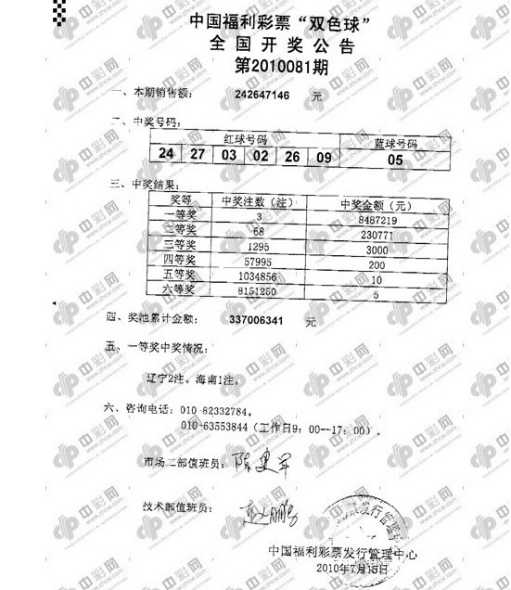 北京时间2010年07月15日晚,福利彩票双色球第2010081期开奖,当期开出的奖号为:红球02 03 09 24 26 27;蓝球05。当晚头奖开出3注848万,被辽宁(2注)和海南2省彩民中得;二等奖68注23万。当期销量2.42亿,计奖后奖池继续上升,已高达3.37亿。[祝贺辽宁本溪一人中1697万大奖]