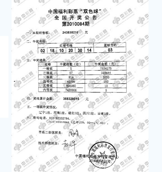 北京时间2010年07月22日晚,福利彩票双色球第2010084期开奖,当期开出的奖号为:红球02 10 14 18 20 30;蓝球03。当晚头奖开出5注753万,被辽宁、河南、湖北、四川及云南等5省彩民中得,二等奖出57注33.34万。当期销量达2.43亿,计奖后奖池再度上升,并创造历史新高3.68亿,此前最高是09111期的3.6493亿。祝贺5省彩民获753万头奖!