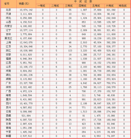 当期红球奖号开出全偶数,蓝球开出小号03,头奖中出5注753万。全偶数也导致二等奖仅57注中出,单注奖金达33.34万,全国仅19个联销省市区分享了二等。其中山东中6注,浙江、江西、湖北、广西和四川各中5注,江苏、深圳各中4注,其他11地均在3注以内。