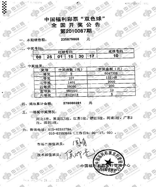北京时间7月29日晚,福利彩票双色球第2010087期开奖,当期开出的奖号为:红球01 08 16 17 25 30;蓝球10。当期开出9注一等奖,每注奖金604万,分别落在7个省市,其中广东、浙江各自中出2注,其他5地各揽1注;二等奖107注,每注奖金13万。全国投注总额为2.35亿,计奖结束后奖池余额下降至2.78亿。[祝贺7省市彩民揽得大奖……]