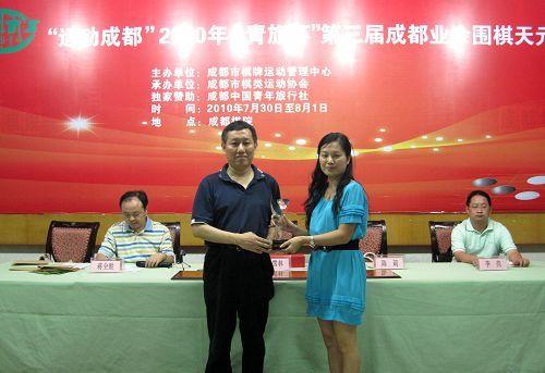 闭幕式上,成都棋院副院长宋雪林向成都中国青年旅行社总经理助理陈莉颁发纪念杯