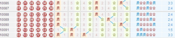 10091期质合比连续四期开出2-4后弹出1-5,092期则回补到3-3,质数有望保持强势,关注以2-4个为主,在近10期开奖中质数全占劣势。质数的后期表现或开始反弹,目前,4质2合已遗漏达18期,需要关注。