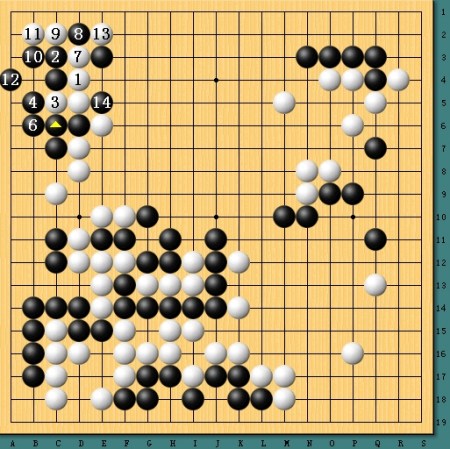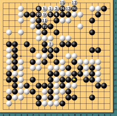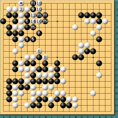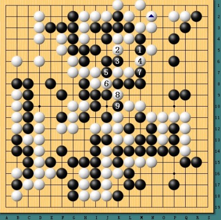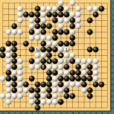 图五,白棋逆转。劫争至最后白棋劫材稍稍不利,于是采取退让,不过获得5位冲下一半,形势顿时逆转。最终,白棋凭借一系列强手完成艰难的逆转。