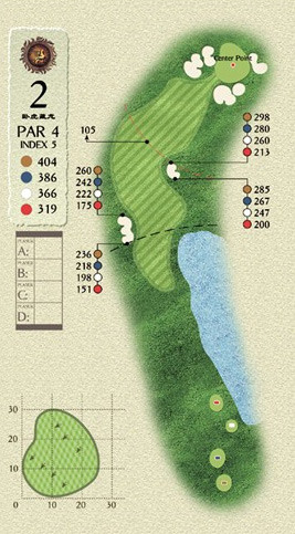 所谓卧虎藏龙,是因为球道右侧有水塘,左侧有OB。如果你的开球落点在230码以上,那么你就可以放心地朝右侧水塘边上的方向打,即可以越过水塘,又可以避开左侧的OB。如果你的开球距离在200码左右,那么面对OB与水塘左右夹击下的狭窄球道,对你落球的精准度就很有考验了,否则会使你的成绩暴涨。你可以用最稳定的球杆将球开出,以三杆上果岭。如果短杆发挥神勇,也很可能打个PAR哟。