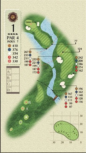 这是一个过水的4杆洞,1号洞的第一杆很重要,要找好落点。如果打得很保守,一定要用3号木或长铁来打,如果1号木比较精准的话,可以尝试冲一下。