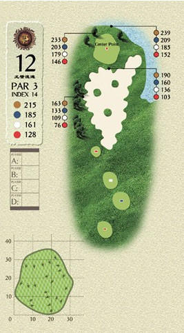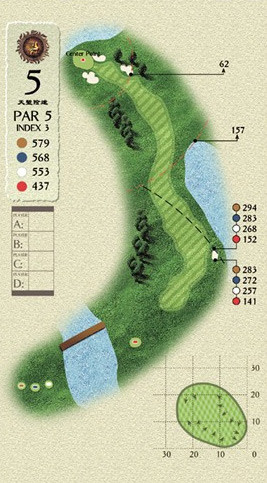 这个洞的最大特点就是在球道上有一个2400平方米,西南地区最大的沙坑,从红TEE一直延伸到果岭,而果岭的后方又是一个水塘,形成一个前后夹击之势。不过,如果你的中长铁不错,那打个PAR也应该不是问题。
