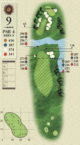 一个大大的左狗腿,球道右侧有大片落球区,要想两杆上果岭,就需要冒险打过球道左侧的沙坑,落点需要220码。如果开球时,你选择安全的球道右侧,那么剩下的距离在170码左右,而果岭周围环绕着沙坑和水塘,随时对你够成威胁,这将使你犹豫不决。那么你可以过度一杆到正水前方,剩下的距离会让你有充分的信心攻上果岭。