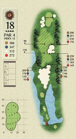 此洞难点在果岭,果岭的前半部分是下坡,很难停住球,攻果岭这杆,宁可打短也不能打长,选择稳健的打法将是首选策略。