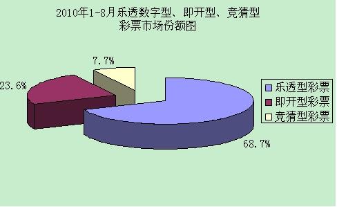 1-8月累计,乐透数字型彩票销售715.11亿元,同比增加68.61亿元,增长10.6%;网点即开型彩票销售193.97亿元,同比增加31.74亿元,增长19.6%;中福在线即开型彩票销售51.62亿元,同比增加49.53亿元;竞猜型彩票销售80.16亿元,同比增加44.75亿元,增长126.3%。1-8月份乐透数字型、即开型和竞猜型彩票销售量分别占彩票销售总量的68.7%、23.6%、7.7%。