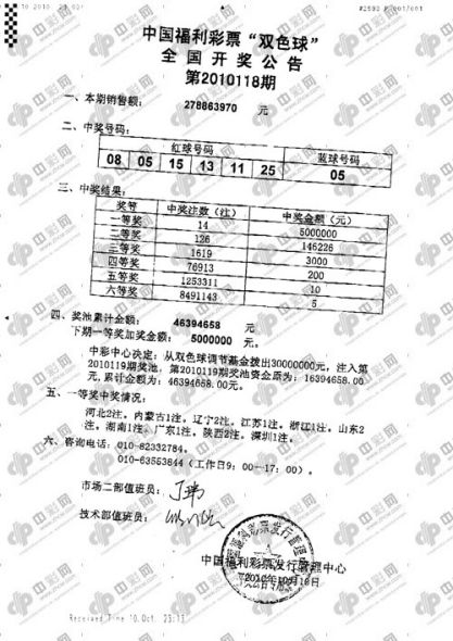 北京时间2010年10月10日晚,福利彩票双色球第2010118期开奖,当期开出的奖号为:红球 05 08 11 13 15 25;蓝球05。一等奖再次喷出14注500万,被11个联销省市彩民分享,其中河北、陕西、山东和辽宁各自中出2注。二等奖开出126注,每注奖金14万。经过三天的销售本期全国投注总额达到2.788亿,创下新的历史纪录,比此前的纪录(10103期)的2.787亿销量多了10万。周二开奖的双色球10119期将正式迎来2亿大派奖。[祝贺10省市彩民分享14注500万头奖]