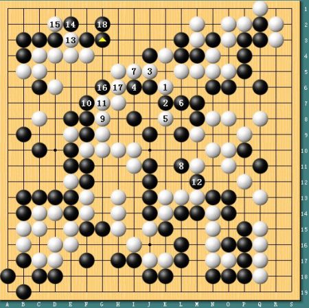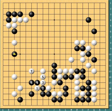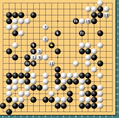 图六,李世石勉强。白1靠寻求腾挪,黑2扳反击过分,此时正好被白3借力。白5飞出头后,黑棋中央逃出的黑棋显得势单力薄。李世石毕竟十分机敏,很快在12位大跳寻求联络。白13爬时黑祭出14位靠的强手,此时白有15位横顶的手段,如此黑棋稍显难过。