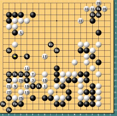 图三,王檄弃子转身获利。实战中李世石弈出黑三角位顶的罕见手段。王檄经过长考后弈出1位扳的超强手,李世石2位扳反击,白3断后逼迫黑棋强吃白棋五子。然而黑10拐稍稍失误,白棋借助五颗死子获得两边便宜的权利。获得先手后白11位飞点位置极佳,李世石为获得先手选择弃子,左上角定式结束后,王檄走到25位扳出,从右边一系列中的战斗中白棋稍稍获利。