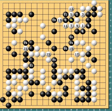 图七,王檄严重误算。实战中王檄没有选择顶,而是选择了1位尖的下法,最终双方出头后再次形成乱战。黑10位尖好手,如此李世石的黑龙迅速与中间联络,并腾出手来在20位贴再连回3颗残子。此时白21位断严重误算,黑因有22位断吃先手,24位拐吃可直接净吃白这一子,王檄这一下损失极为严重。
