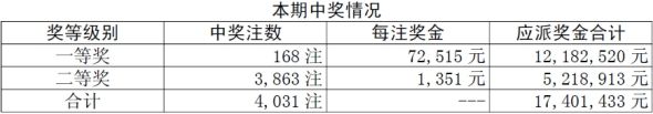 北京时间10月25日,胜负彩10101期开奖,一等奖168注,每注奖金72515元。二等奖3863注,每注奖金1351元。本期胜负彩销售量为:27,193,186元,任选九场销售量为:23,698,018元。[本期您中奖了吗?]