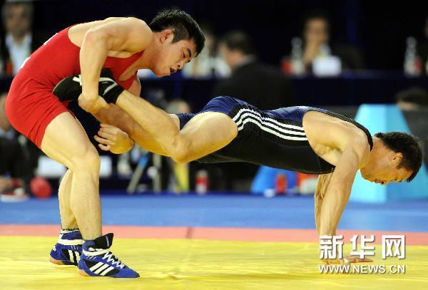 11月23日,乌兹别克斯坦选手迪尔绍德·曼苏罗夫(下)和朝鲜选手梁景一在比赛中。当日,在第16届亚运会摔跤男子自由式55公斤级决赛中,乌兹别克斯坦选手迪尔绍德·曼苏罗夫战胜朝鲜选手梁景一,夺得冠军。新华社记者燕雁摄