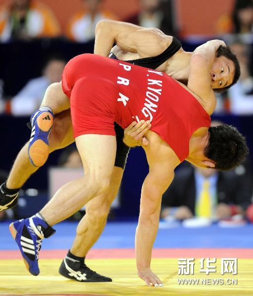 11月23日,乌兹别克斯坦选手迪尔绍德·曼苏罗夫(上)和朝鲜选手梁景一在比赛中。当日,在第16届亚运会摔跤男子自由式55公斤级决赛中,乌兹别克斯坦选手迪尔绍德·曼苏罗夫战胜朝鲜选手梁景一,夺得冠军。新华社记者燕雁摄