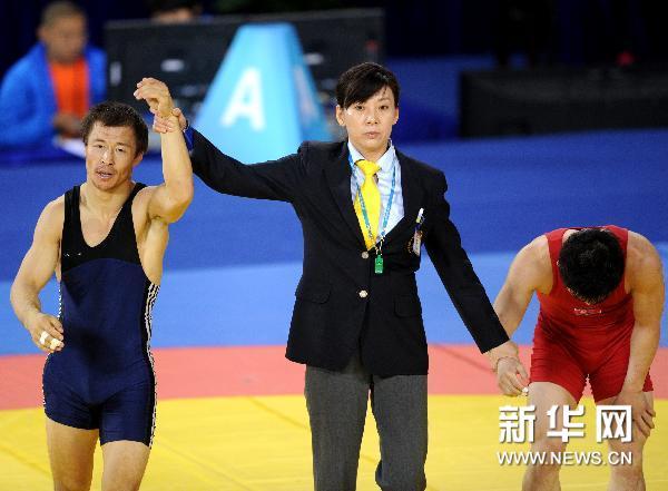 11月23日,裁判宣布乌兹别克斯坦选手迪尔绍德·曼苏罗夫(左)在比赛中获胜。当日,在第16届亚运会摔跤男子自由式55公斤级决赛中,乌兹别克斯坦选手迪尔绍德·曼苏罗夫战胜朝鲜选手梁景一,夺得冠军。新华社记者燕雁摄