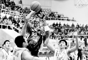 在昨天的CBA新赛季首轮比赛中,曾在NBA效力的马布里代表佛山队出战,图为他轻易突破两位八一队队员的防守 图/CFP