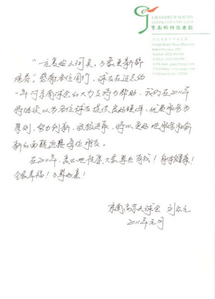 北京时间1月28日消息 又是一年春来到,2月3日将迎来中国人民的传统节日--农历辛卯年春节,值此佳节来临之际,北京京南乡村高尔夫球会总经理刘众元通过新浪网高尔夫频道向全国高尔夫球友拜年。