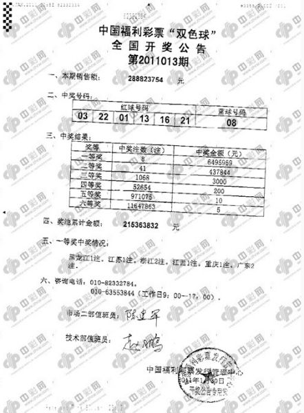北京时间2011年01月30日晚,福利彩票双色球第2011013期开奖,当期开出的奖号为:红球 01 03 13 16 21 22;蓝球 08。当晚头奖开出8注649万,分别被浙江(2注)、广东(2注)、江苏、江西、黑龙江和重庆彩民中得;二等奖开出41注43万7。当期销量2.88亿,计奖后奖池降至2.15亿。祝贺6地彩民幸运中649万头奖>>>
