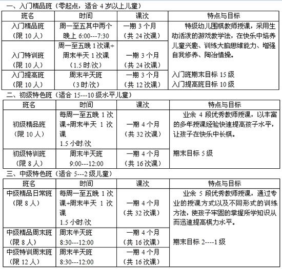 您想让您的孩子在学龄前冲上段位吗?因为这是孩子学棋最佳的年龄及时间段。升上段位的孩子计算力、记忆力、逻辑思维能力都有明显的提高,对上学的孩子帮助很大。因此我们针对这样的特点给孩子们制定了全、半日围棋冲段班,让孩子在最短时间内得到最大的收获。