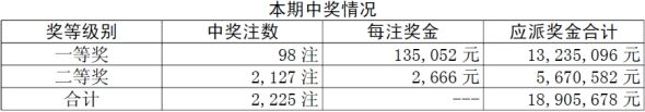 胜负彩18期开奖:一等奖98注13万 二等奖2666元