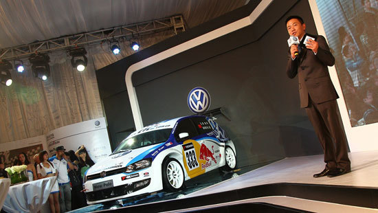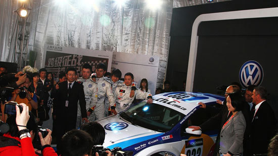 周日上午,天马赛车场热闹的围场里,上海大众333车队以一场隆重而热烈的新赛车发布会正式发布2011赛季全新赛车“New Polo-T”,上海大众及汽联领导出席,与上海大众333车队4名车手一起,为新赛车揭幕并一起按下新赛车引擎的启动按钮。