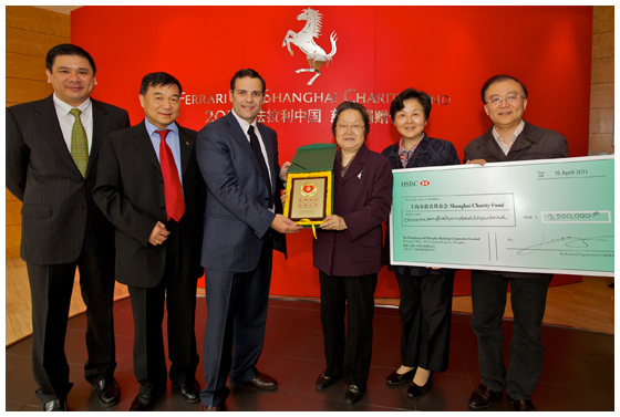2011年4月17日,上海——2011年F1上海大奖赛拉开战幕,法拉利中国车主齐聚上海,与法拉利车队一起尽享赛道激情。决赛当日,法拉利在华经销商及数十位车主携其爱驾组成车队,在上海国际赛车场举行别开生面的赛道巡游,这是F1自1950年创始以来,首次在决赛前举行的单一品牌车队巡游活动。此次慈善巡游由法拉利中国、法拉利车主俱乐部、上海大奖赛主办方联合举办,并得到由Bernie Ecclestone 先生领导的F1管理委员会大力支持。活动得到了法拉利中国车主的积极响应并募得善款共计350万元人民币,旨在传播赛车文化并为上海市慈善基金会募集善款,用于帮助有医疗需求的儿童。在上海赛事期间,法拉利还举办了一系列活动,包括盛大的年度F1晚宴及善款交送仪式。法拉利大中华区总裁及首席执行官Mr. Edwin Fenech(范艾闻)先生,同上海法拉利俱乐部主席朱裕华先生及法拉利中国车主会会长甄荣辉先生将全部善款共同转交给上海市慈善基金会名誉理事长陈铁迪女士。