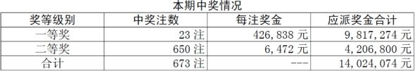 胜负彩11043期开奖,一等奖23注,每注奖金426838元;二等奖650注,每注奖金6472元,本期胜负彩销售量为:21913598元。