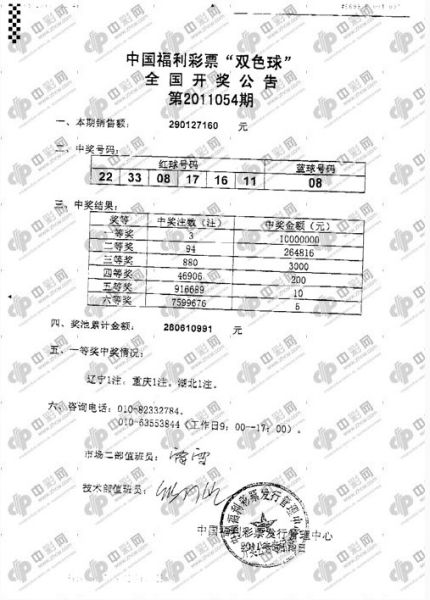 北京时间2011年05月12日晚,福利彩票双色球第2011054期开奖,当期开出的奖号为:红球 08 11 16 17 22 33;蓝球08。一等奖开出3注足额1000万,被辽宁、重庆和湖北彩民摘得,二等奖出94注,每注奖金26.4万。全国投注总额为2.9亿,计奖结束后奖池余额上升到2.8亿。[您预测下期蓝球会开出哪个号码?]