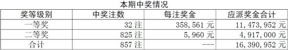胜负彩11055期开奖,一等奖中出32注,每注奖金358561元;二等奖825注,每注5960元。本期胜负彩销售量为:25611560元。任选九场头奖出5450注1811元。