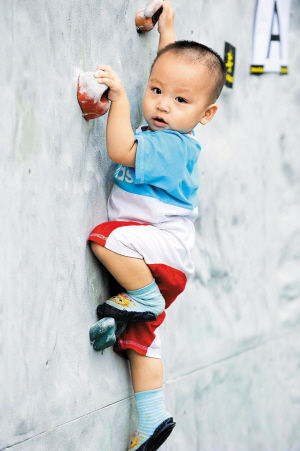 6月4日,第四届全国青年攀岩锦标赛在深圳市仙桐体育公园攀岩区举行。在赛场,记者发现一个蹒跚学步的小不点儿在家长的指挥下攀爬岩壁,许多人颇为好奇。一打听,小孩刚刚15个月,他的名字叫赵奇。