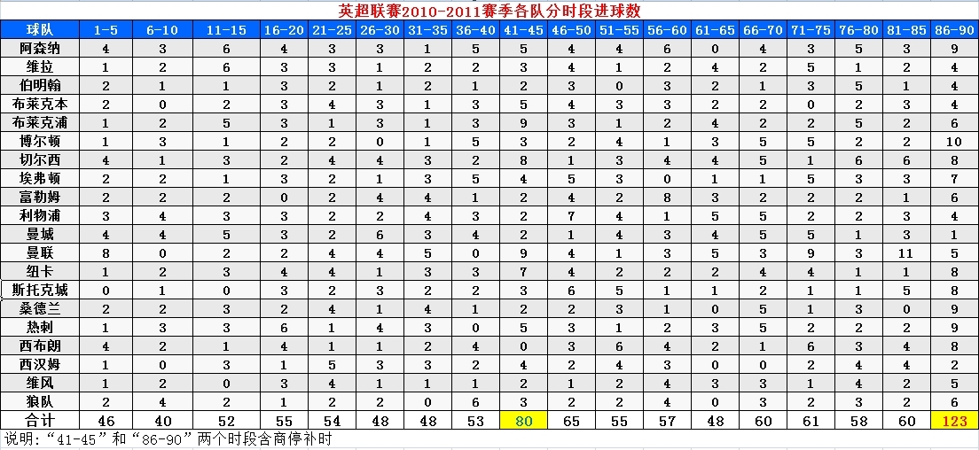 在上赛季的上下半场进球对比中,20支球队中的15支球队在下半场的进球数要多于上半场的进球数,只有曼城、布莱克浦和西汉姆上半场的进球数多于下半场,纽卡和布莱克本则是上下半场进球数持平。这个数据充分说明英超球队超强的体能和持续进攻能力。