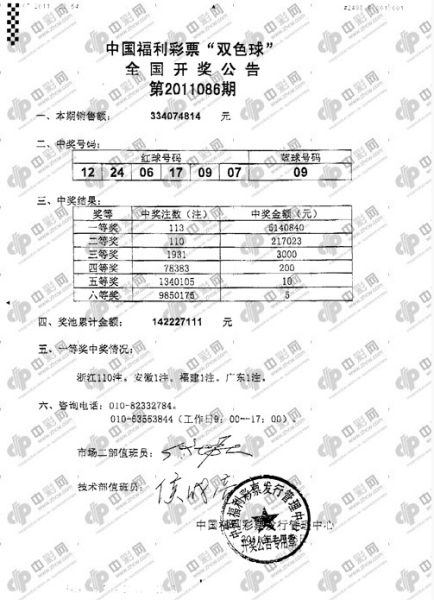 北京时间2011年07月26日晚,福利彩票双色球11086期开奖,当期开出奖号为:红球06 07 09 12 17 24;蓝球09。一等奖狂喷113注,每注奖金514万,浙江省独揽110注,其中100注出自绍兴同1彩站,这100注一等奖出自于两张彩票,而每一张彩票上分别有两组相同彩票号码,并且每一组号码皆为25倍投。最新消息,巨奖投注站老板确认2张彩票为一人所买,1中年男子独揽5.14亿大奖,创造中国彩市的新纪录!同时这也是双色球历史上的第一大井喷,超越了曾创造3.599亿元的单期93注的纪录!
