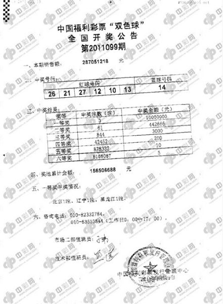 北京时间2011年08月25日晚,福利彩票双色球第2011099期开奖,当期开出的奖号为:红球 10 12 13 21 26 27;蓝球 14。一等奖出3注1000万,二等奖61注44.2万,分别被北京、辽宁和黑龙江彩民获得。全国投注总额2.87亿,计奖结束后奖池余额继续上升至1.56亿元。