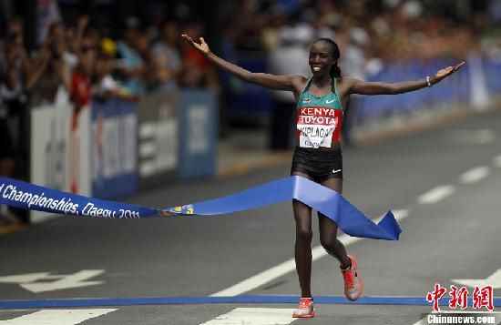 8月27日,第13届田径世锦赛在韩国大邱开幕,女子马拉松比赛中,肯尼亚选手基普拉加特夺得本届第一金。中国的朱晓琳排在第六位。中新社发 杜洋 摄