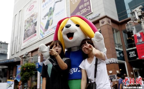 8月27日,第13届田径世锦赛在韩国大邱开幕。图为大邱田径世锦赛吉祥物在路边和观众合影。中新社发 杜洋 摄