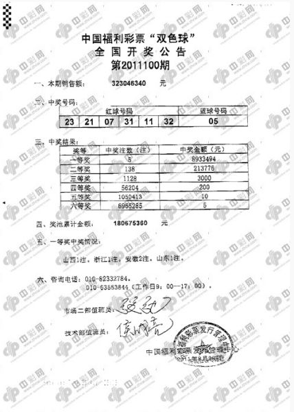 北京时间2011年08月28日晚,福利彩票双色球第2011100期开奖,当期开出的奖号为:红球 07 11 21 23 31 32;蓝球 05。一等奖出5注893万,二等奖138注21.3万,分别被山西、浙江、安徽和山东彩民获得。全国投注总额3.23亿,计奖结束后奖池余额继续上升至1.8亿元。