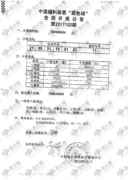 北京时间2011年09月01日晚,福利彩票双色球第2011102期开奖,当期开出的奖号为:红球 01 05 13 21 27 31;蓝球 11。一等奖井喷12注590万,二等奖116注14万,分别被10省市彩民获得。全国投注总额3.03亿,计奖结束后奖池余额下降至1.62亿元。