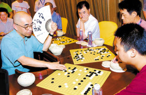 | 武宫正树(左前)今年7月与内蒙古的多名业余棋手同时对弈 |