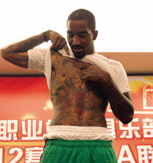 | J.R。史密斯指着右边胸口一处头像的文身说:“这对我来说意义非凡,因为这是我母亲。” |