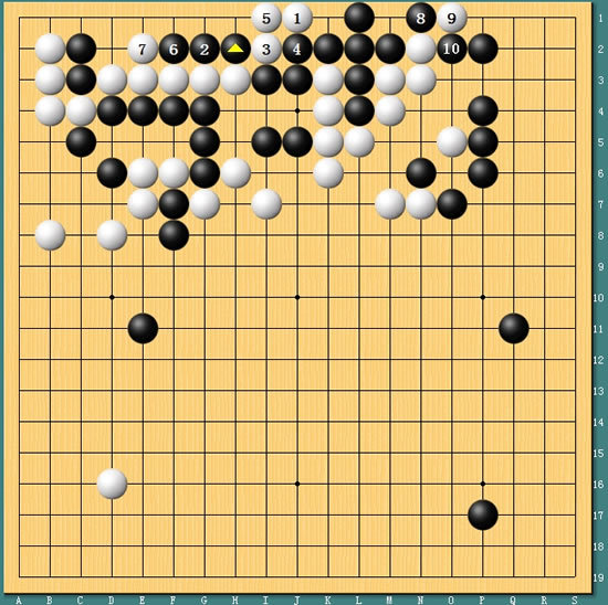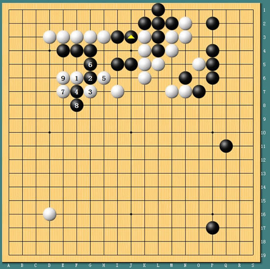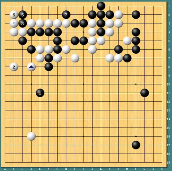 图2:左上的作战,古力黑1大飞相当漂亮。但上边黑棋第7手扳后,局部留下一个被打劫杀的隐患。