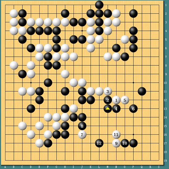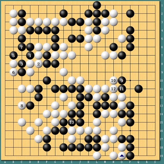 图7:虽然白棋活得非常巧妙,但古力还是掌控着局势。黑棋在左右两边先手便宜,间接补掉了上边的打劫隐患,然后冷静地在13位连回,全局黑棋还是有盘面10目左右的优势。最终本局进行至148手,古力中盘胜出。